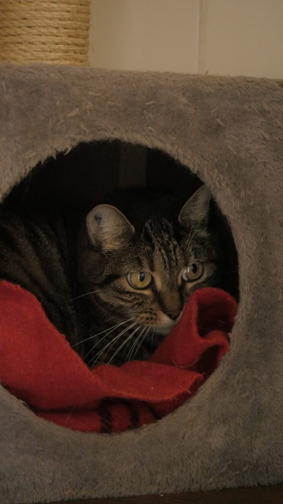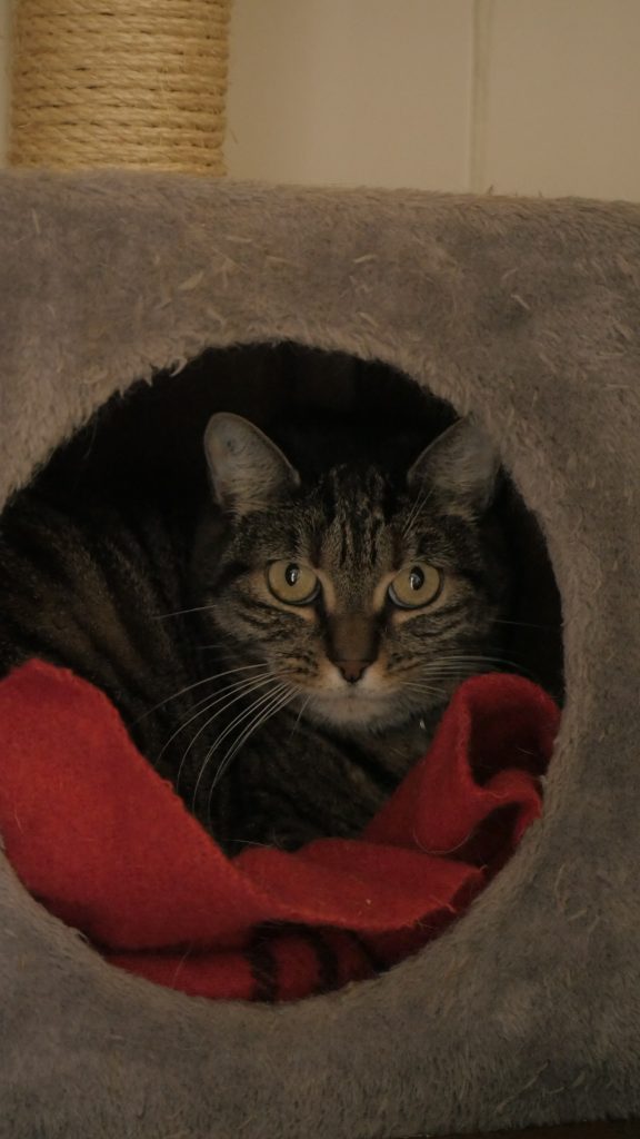 C’est une minette un peu timide qui se demande un peu ce qu’elle fait en refuge. Il lui faudra un peu de temps pour se détendre.