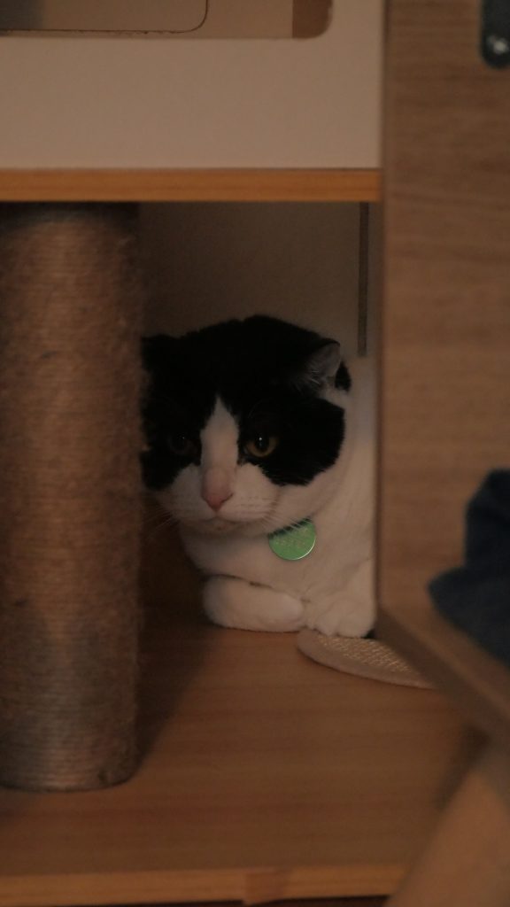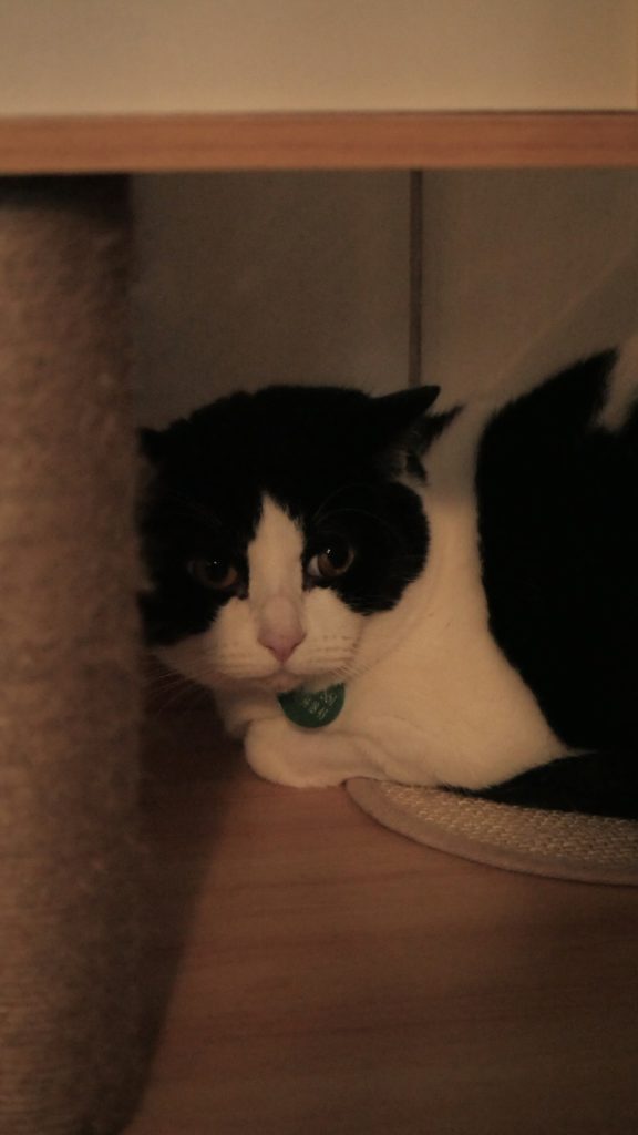 Timide au premier abord, c’est une chatte qui a besoin d’un peu de temps pour être en confiance.