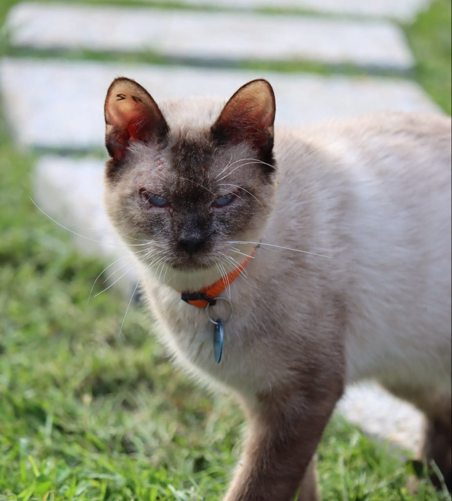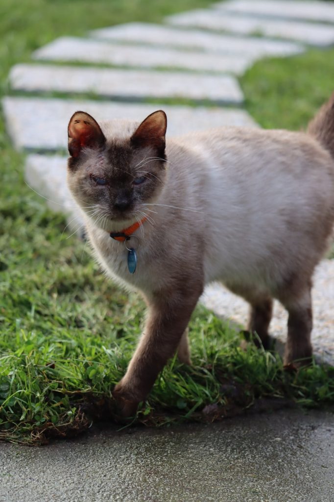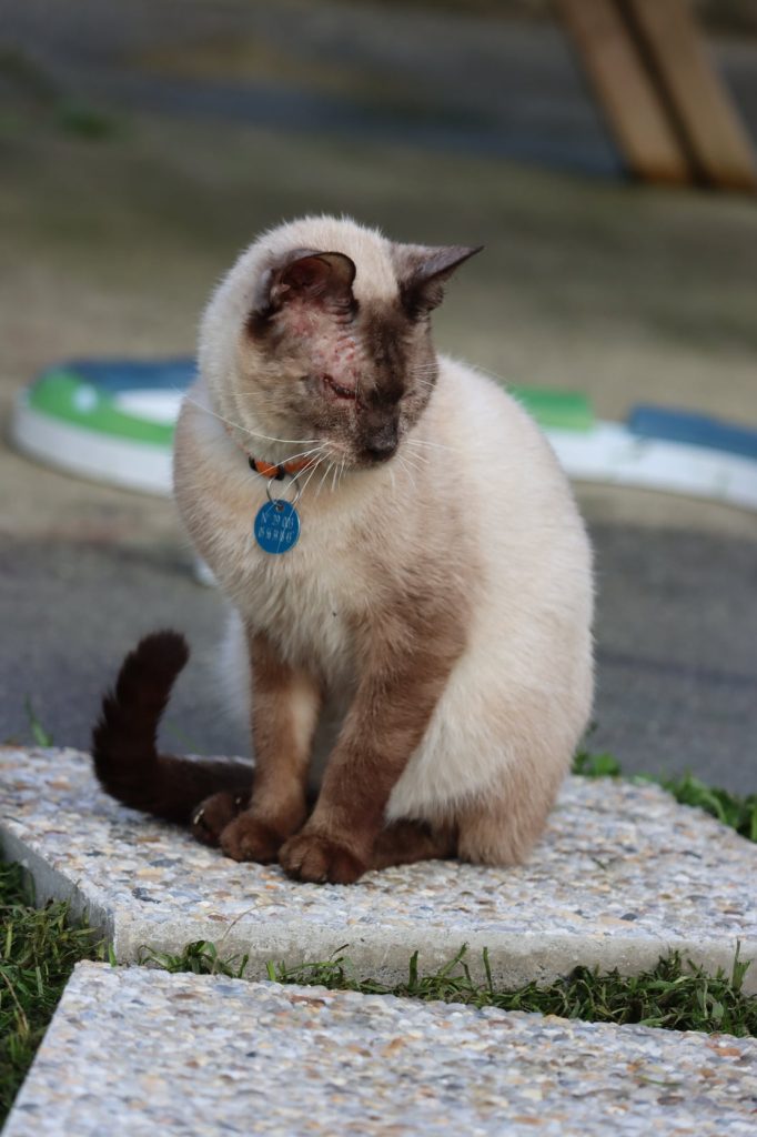 Il est possible également qu’il soit malvoyant et ataxique mais cela ne l’empêche absolument pas de mener sa petite vie tranquille et d’interagir avec les humains et les chats normalement.