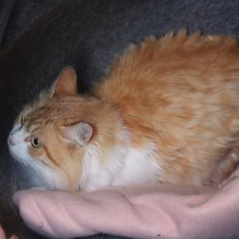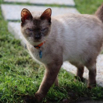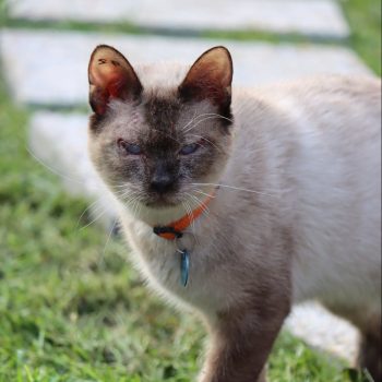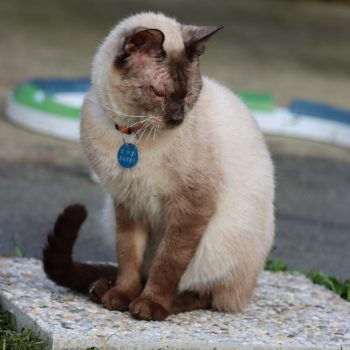 Il est possible également qu’il soit malvoyant et ataxique mais cela ne l’empêche absolument pas de mener sa petite vie tranquille et d’interagir avec les humains et les chats normalement.