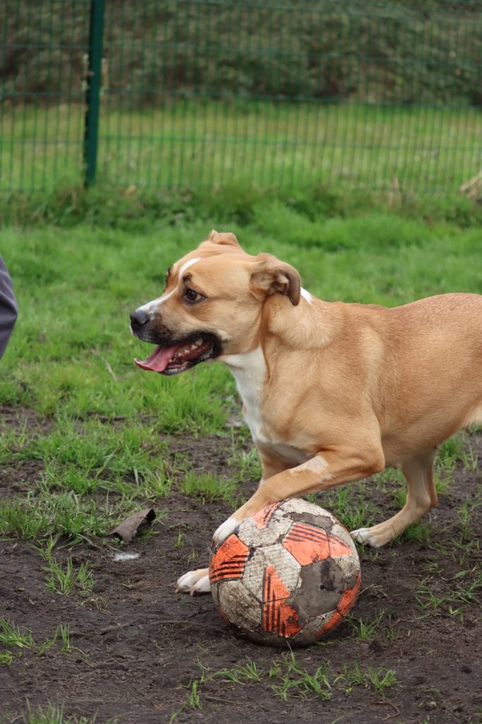 Une fois en confiance, elle se montre câline et joueuse (une vraie joueuse de foot !) avec les personnes qu’elle connaît bien. Avec elle, il suffira simplement de respecter son rythme et de lui laisser le temps de faire connaissance progressivement.